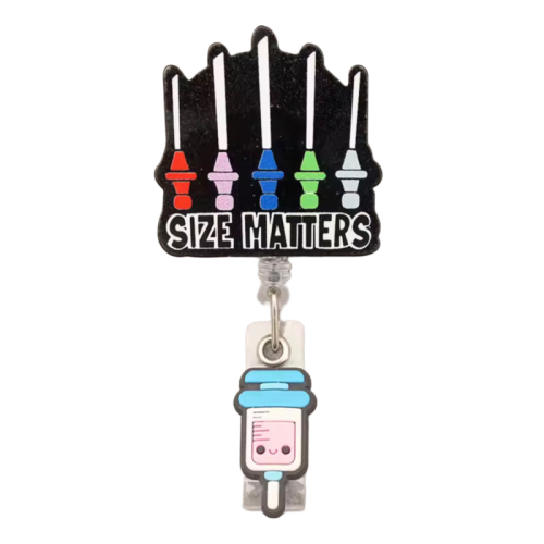 Porta ID divertido con diseño de instrumentos médicos y mensaje “Size Matters”. Ideal para profesionales con sentido del humor y estilo.