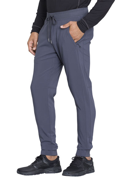 Stylish and super comfortable, this men's jogger pant features a natural rise, five pocket styling including three zip pockets to keep your items secure plus a cargo pocket with cell phone pocket, and rib knit cuff at back hem. As an added detail, the waistband offers a fun pop of color inside while remaining soft and comfortable on the skin. These joggers are a great piece that can transition from work to everyday life. Leg Opening 10 1/2". Inseam: 31". The comfortable stretch poplin fabric and super stretchy rib knit is the perfect combo for healthcare professionals.