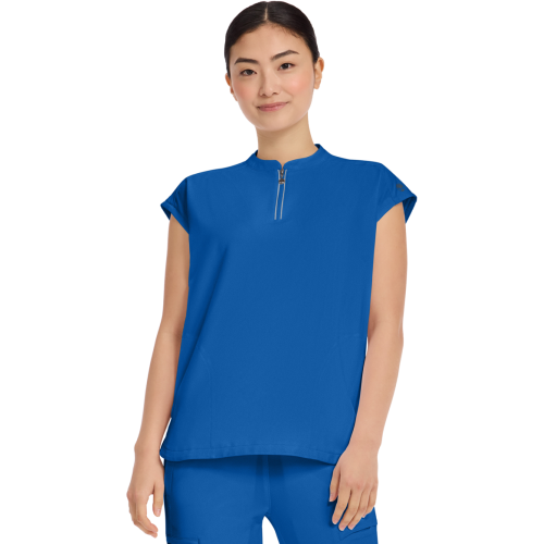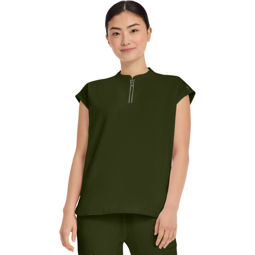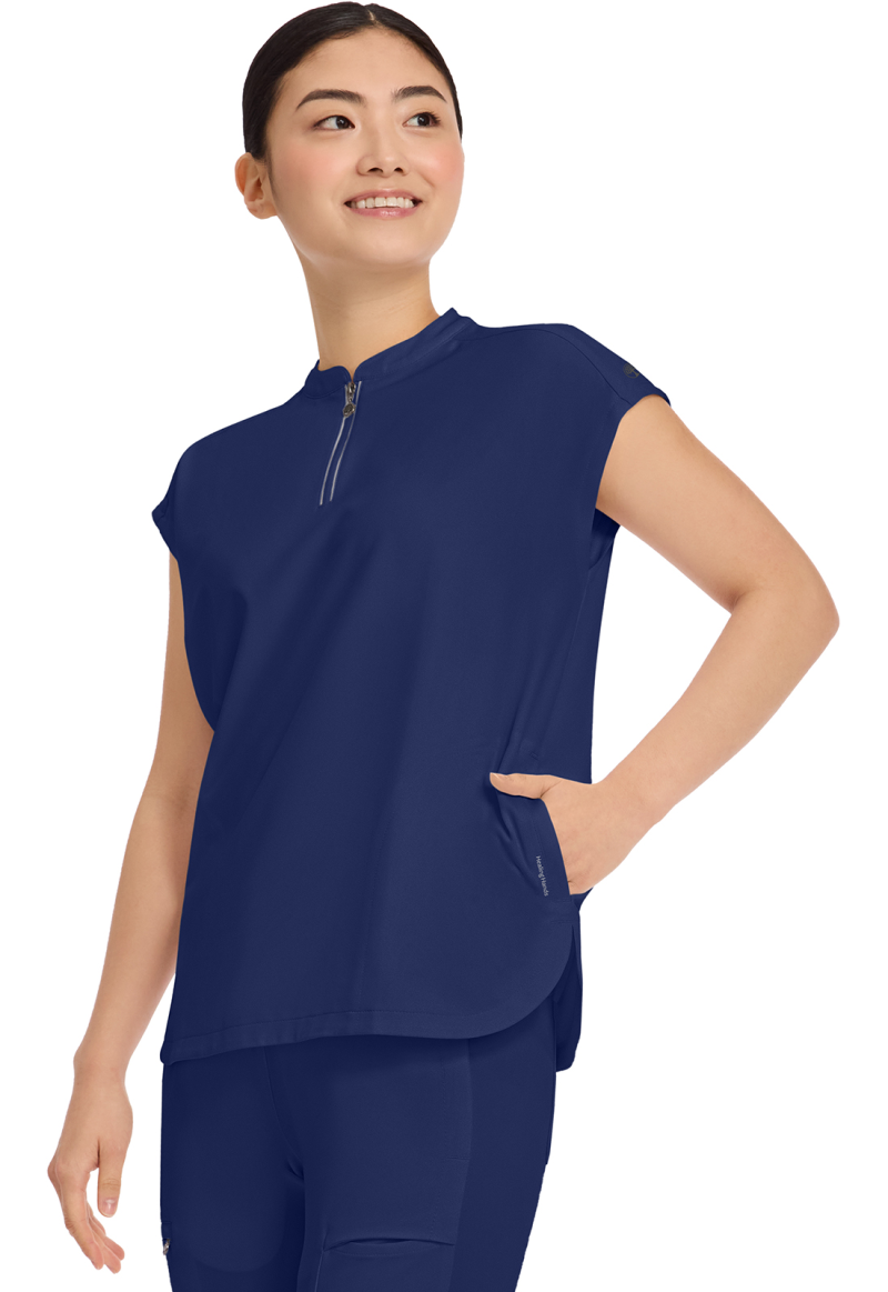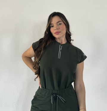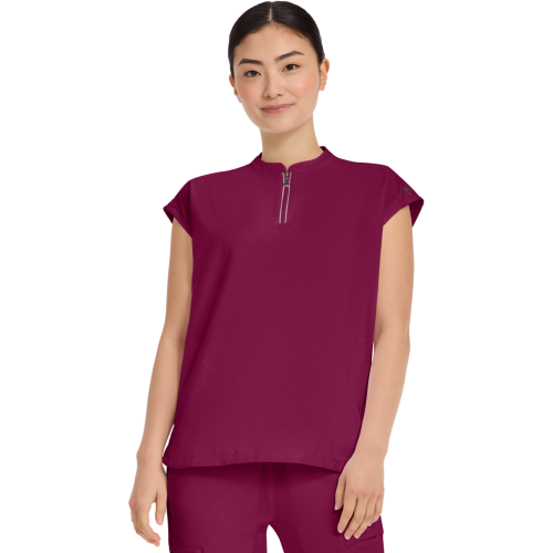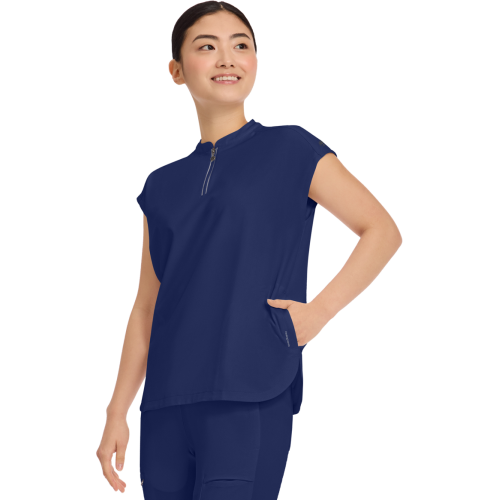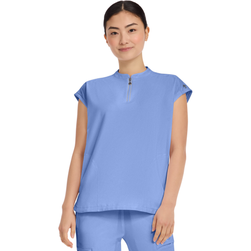 Top boxy oversized y cómodo con cuello mandarín. Cuenta con escote con cuello y media cremallera, mangas tipo dolman, 2 bolsillos tipo ribete (welt), dobladillo redondeado y detalle de pliegue tipo box en el canesú trasero. El acabado en tejido knit en los hombros delanteros y en el canesú trasero añade un toque especial a la prenda.
