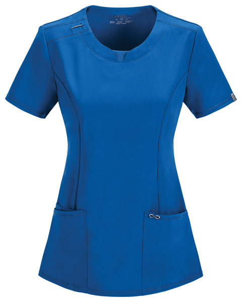 A Contemporary fit round neck top with a rib knit inset at the front neckband also featured are shoulder yokes, a bungee I.D. badge loop on the right shoulder, front and back princess seams, two patch pockets, one interior pocket, and side vents. Stretch rib knit at the center back panel gives this top its slimming shape and allows for extra movement and comfort. Coverstitch detail throughout. Center back length: 26"