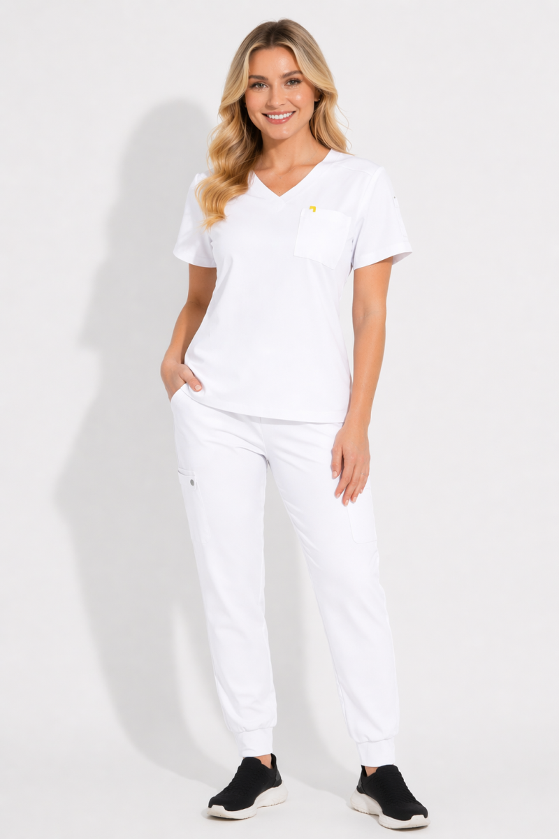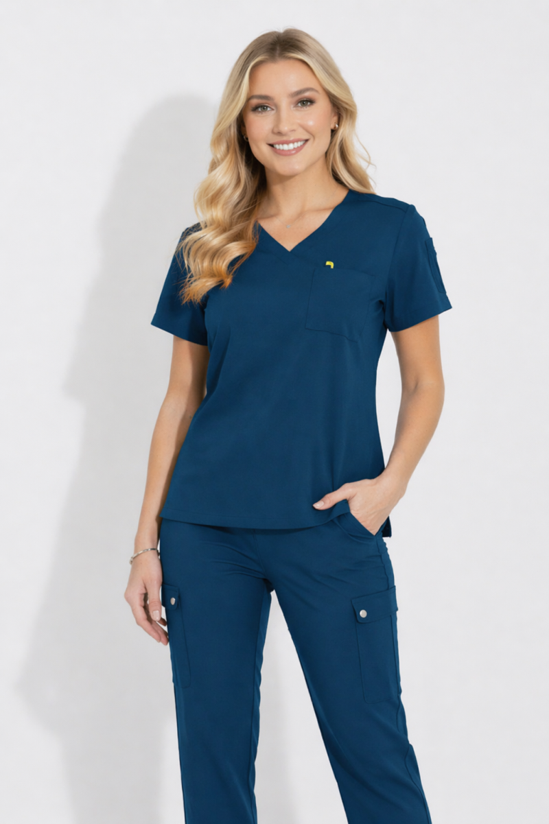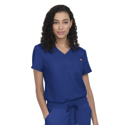 La solución para el scrub común. Una blusa fresca y funcional que luce excelente tanto por dentro como por fuera del pantalón. Cuello clásico en V, bolsillo en el pecho, bolsillo en la manga,3 espacios para bolígrafos, Aberturas laterales para mayor comodidad y movimiento, largo (talla Small): 26 1/2 pulgadas