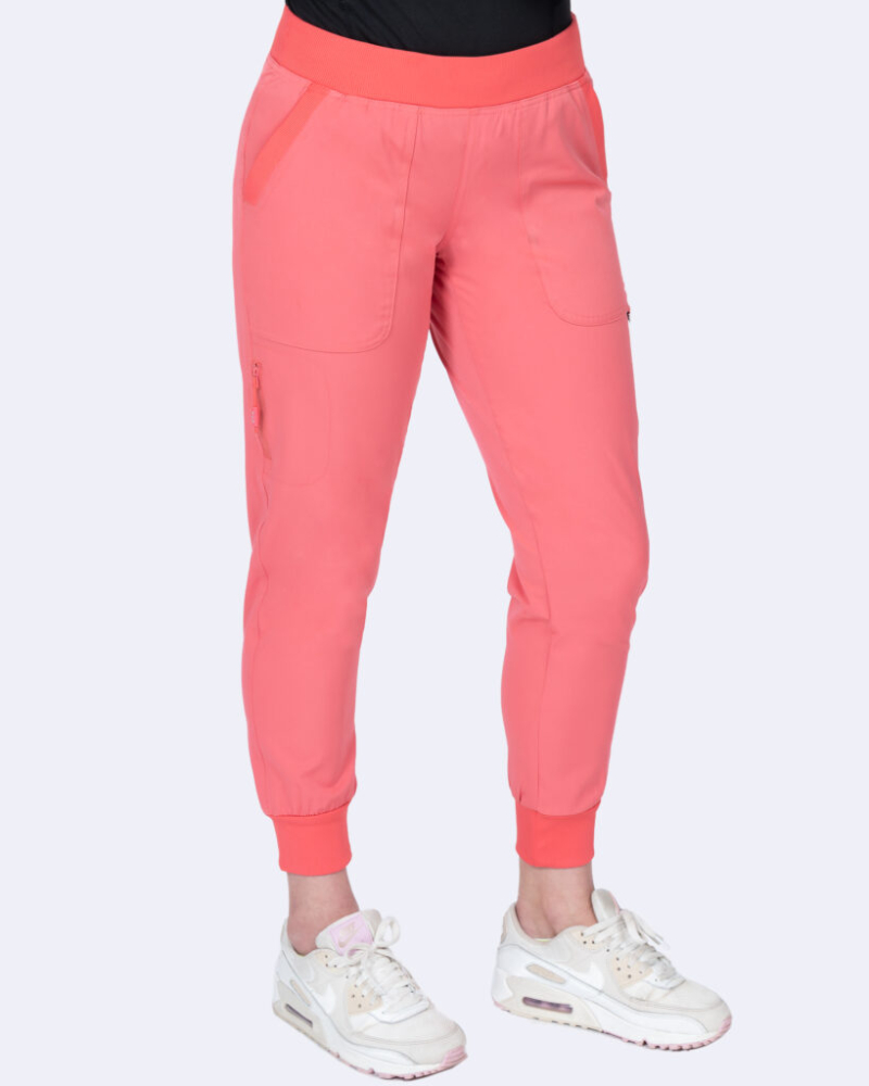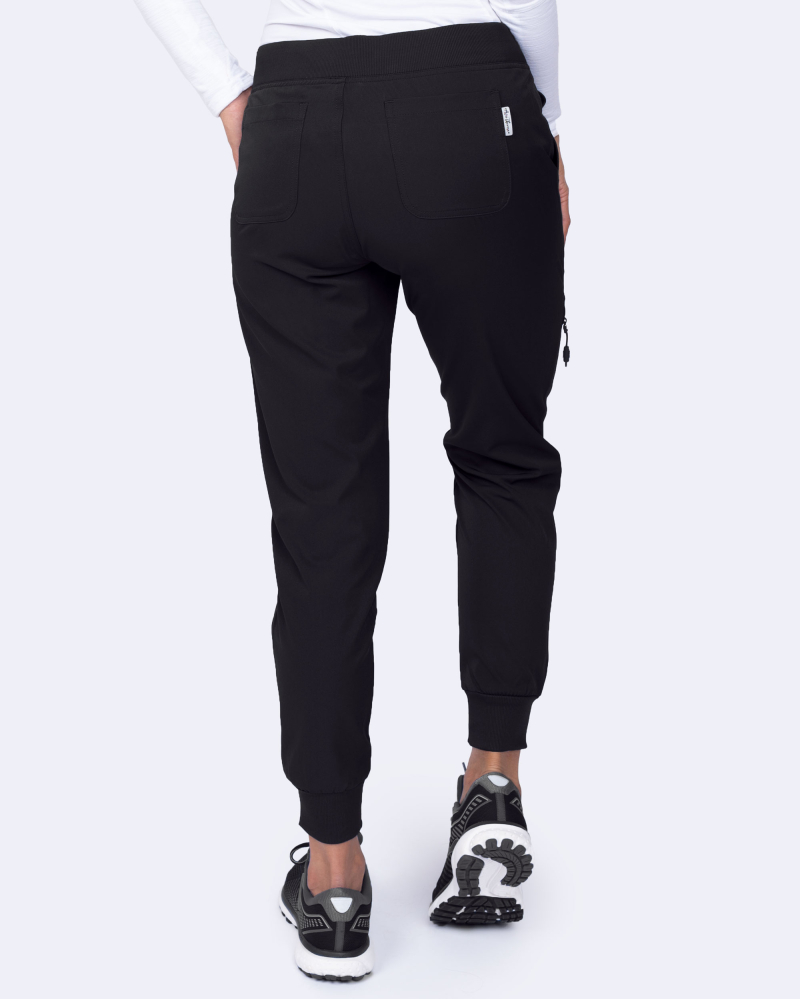 Elastic rib knit waistband with internal drawstring Two on-seam front curved patch pockets with rib knit detail at pocket entry Additional front side zipper pocket with removable logo zipper pull Two back curved patch pockets with “Ava Therese” reflective flasher on right pocket Heart arrow logo embroidery on wearer’s left patch pocket Self tab with utility gunmetal d-ring Tapered jogger pant leg with rib knit cuffs