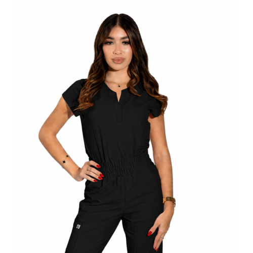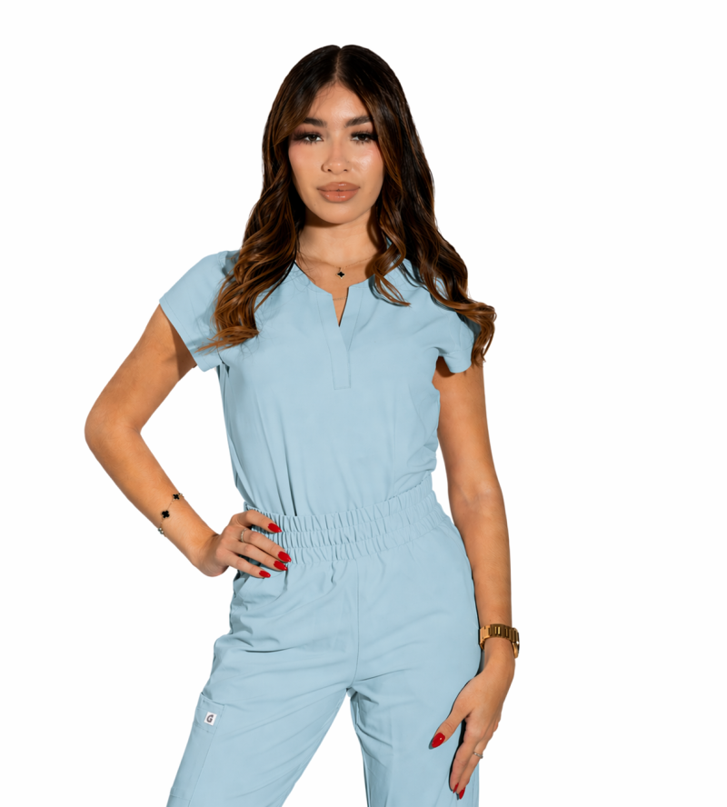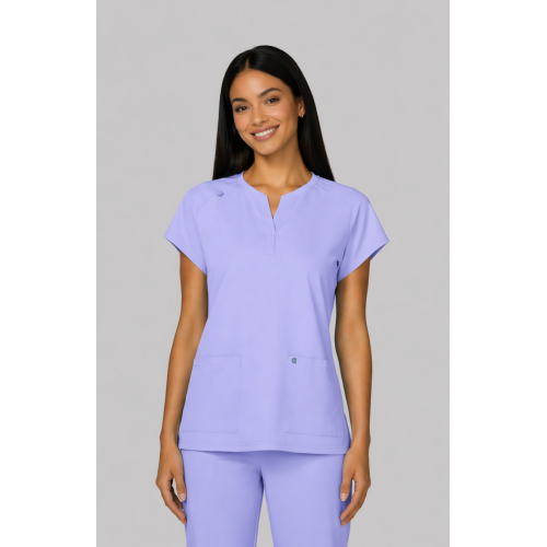 Reese Top– Blusa moderna con cuello en V abierto, mangas raglán para mayor movilidad, dos bolsillos frontales funcionales, 26 pulgadas de largo, tela strech 100% poliéster y diseño comodo con aberturas laterales para facilitar movimiento.