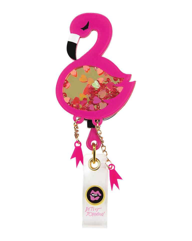 Betsey Johnson Flamingo Retractable ID Badge Reel features a button-snap with Betsey Johnson logo.
