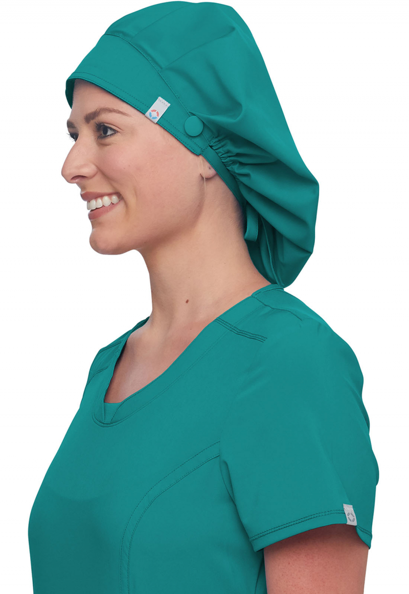 This roomy bouffant scrubs hat features buttons by ears to comfortably hold the protective face mask in place. (Mask sold separately.) Hat also includes front pleats with enough fullness for complete hair coverage and terry cloth sweatband for comfort. Back elastic plus adjustable ties for a secure fit. Certainty label on left side. Unisex fit