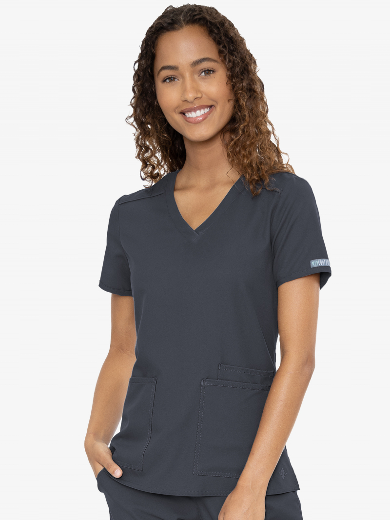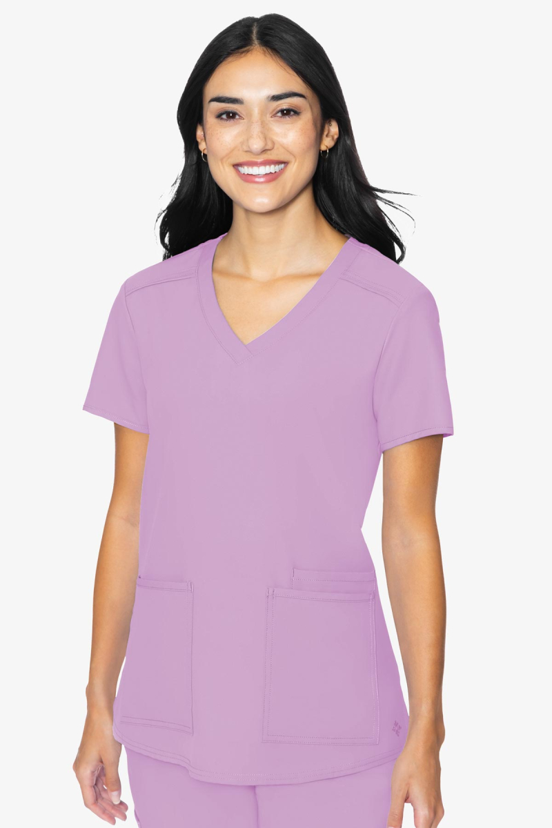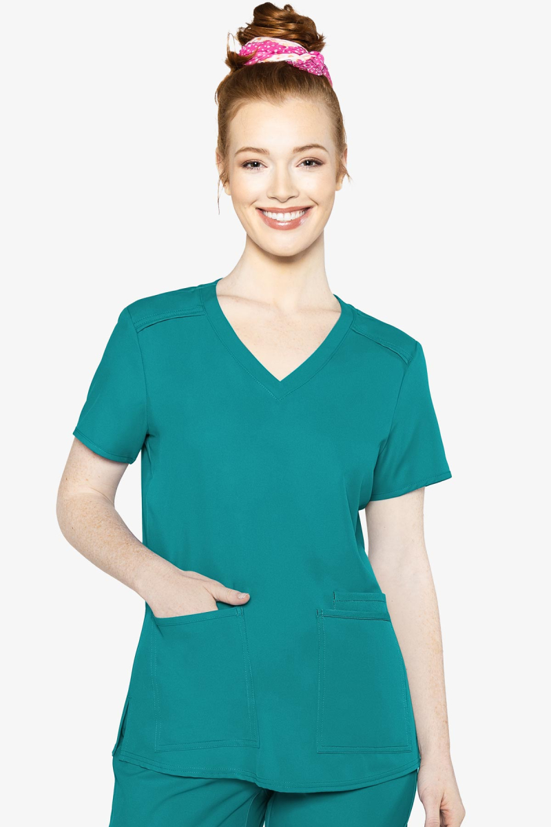 This top holds a standard V-neck with self-binding detail at the shoulder.