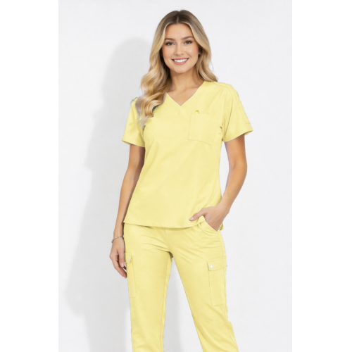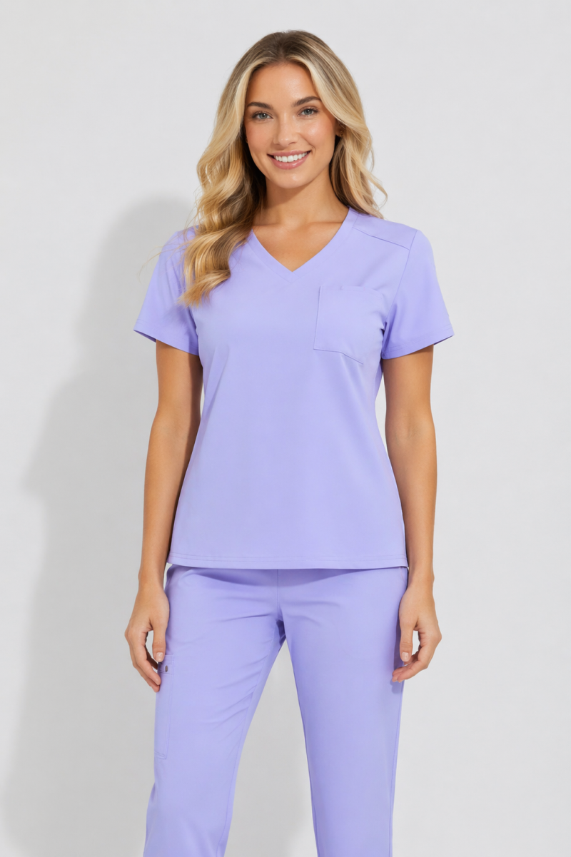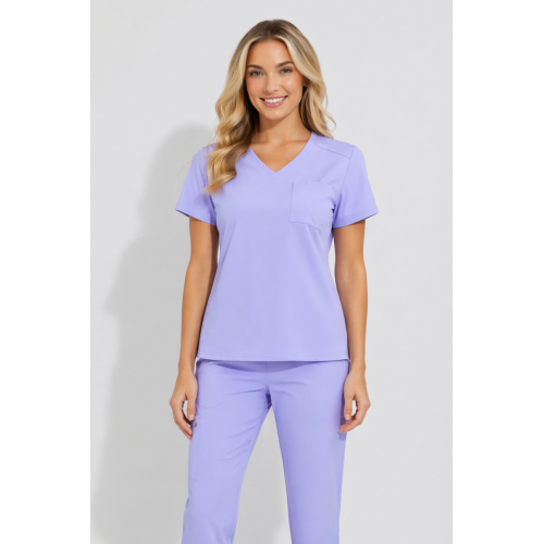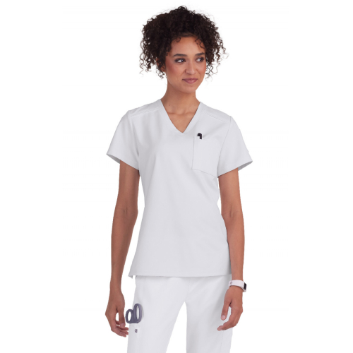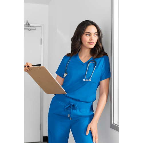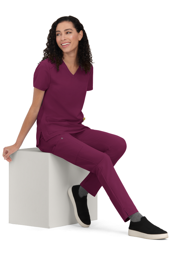 La solución para el scrub común. Una blusa fresca y funcional que luce excelente tanto por dentro como por fuera del pantalón. Cuello clásico en V, bolsillo en el pecho, bolsillo en la manga,3 espacios para bolígrafos, Aberturas laterales para mayor comodidad y movimiento, largo (talla Small): 26 1/2 pulgadas