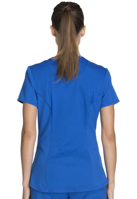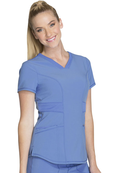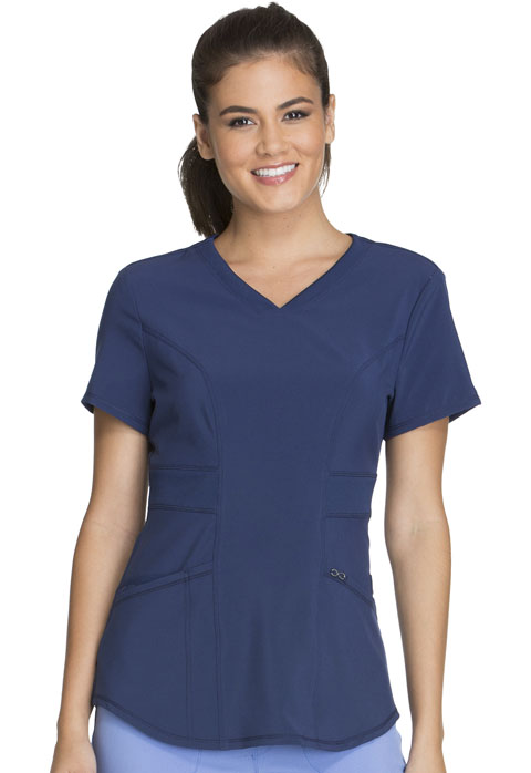 A Contemporary fit V-neck top features a rib waist inset and stretch rib knit panel at the center back for a slenderizing effect, as well as for extra movement and comfort. Also featured are two patch pockets, an interior pocket, pencil stitch, bungee I.D. badge loop, front and back princess seams, a shirttail hem, side vents and coverstitch detail throughout. Center back length: 26”. The comfortable stretch poplin fabric and super stretchy rib knit is the perfect combo for healthcare professionals.
