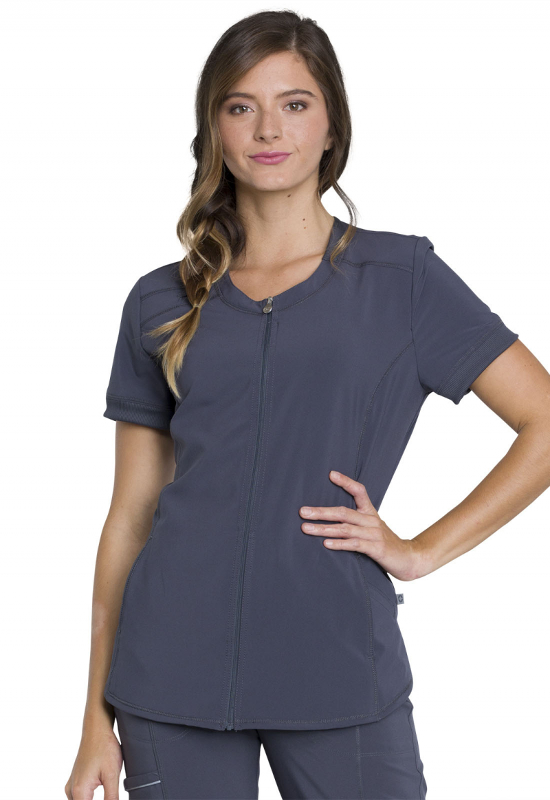 Add a touch of modern polish to your medical wardrobe with this flattering mixed media V-neck top, finished with exposed zip styling for subtle edge. Touches of rib-knit at the neck, cuffs, and center back panel provide comfort and flexibility, in addition to side vents that allow for greater ease of movement. The style also features a shirttail hem, front welt and in-seam pockets for storage, and princess seaming to create a slim silhouette. Contemporary fit. Center back length: 26". The comfortable stretch poplin fabric and super stretchy rib-knit is the perfect combo for healthcare professionals.