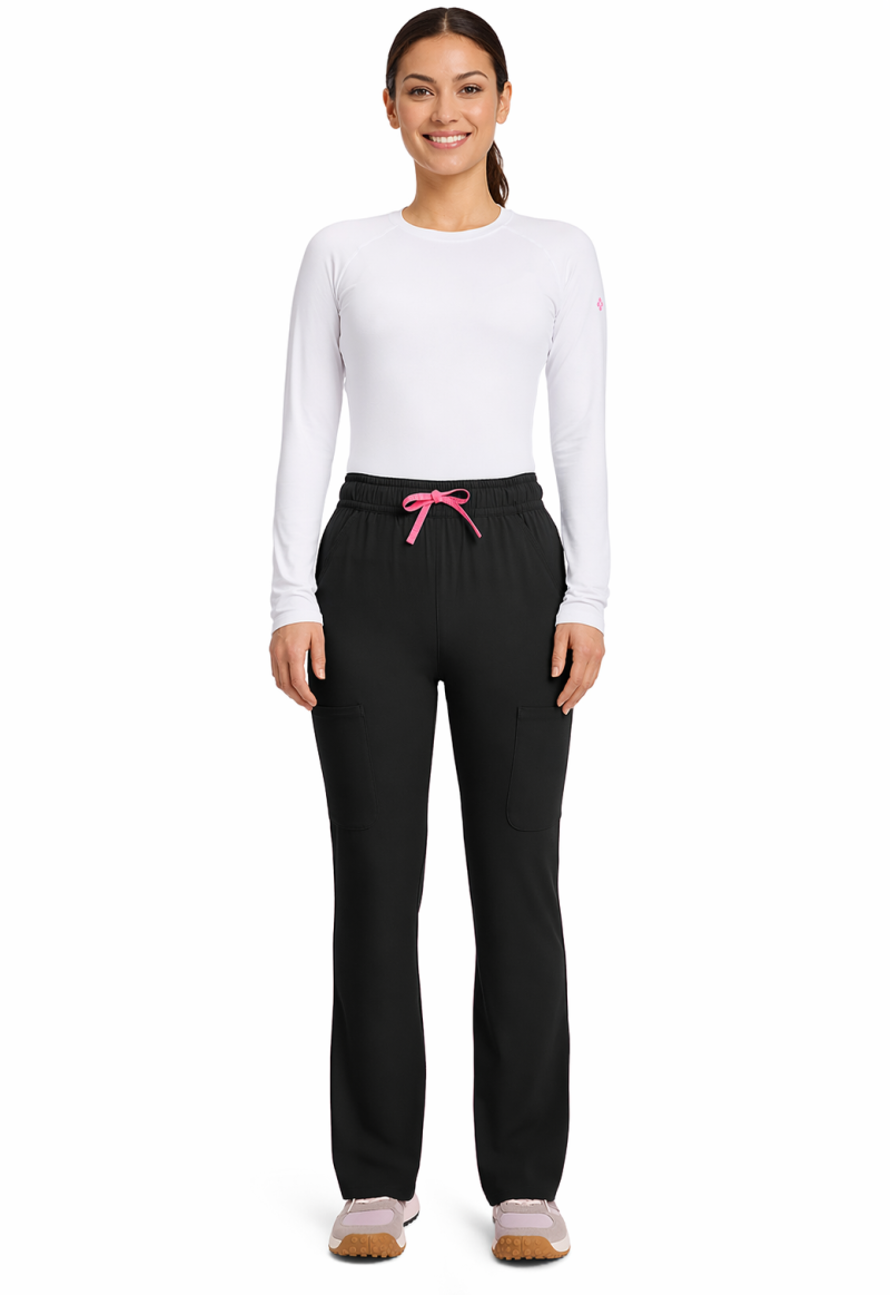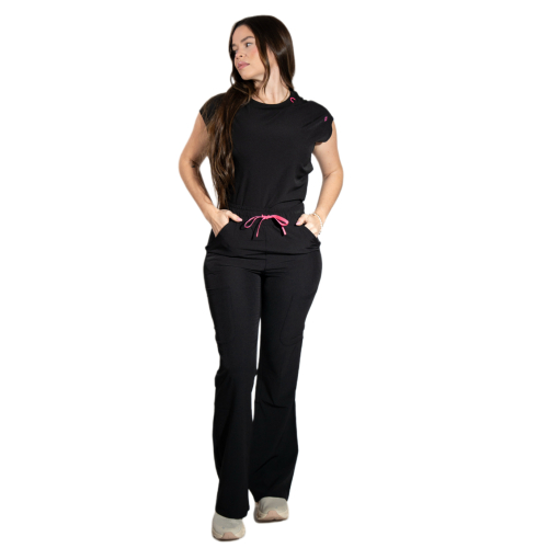 Pantalón de tiro alto con un toque de campana, perfecto para un look moderno y favorecedor. Luce ideal con tops médicos por dentro o ligeramente cortos. Su tela súper elástica brinda comodidad y libertad de movimiento, mientras sus bolsillos tipo cargo añaden practicidad sin perder su silueta estilizada. Entrepierna: 29"