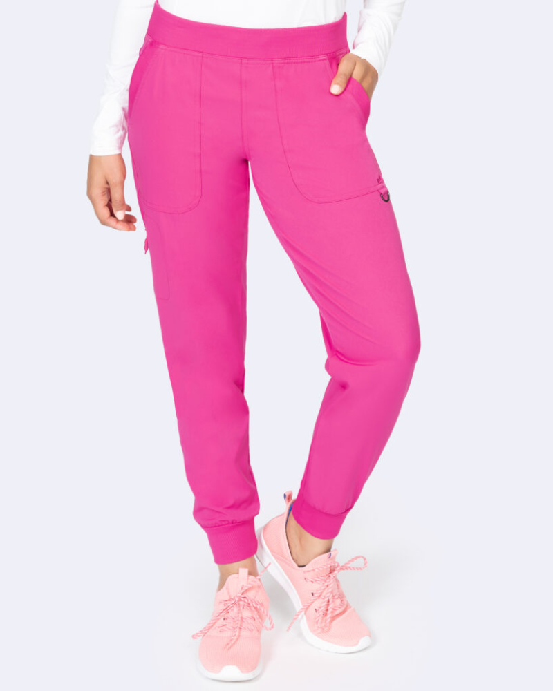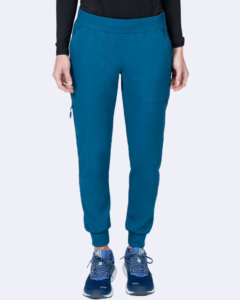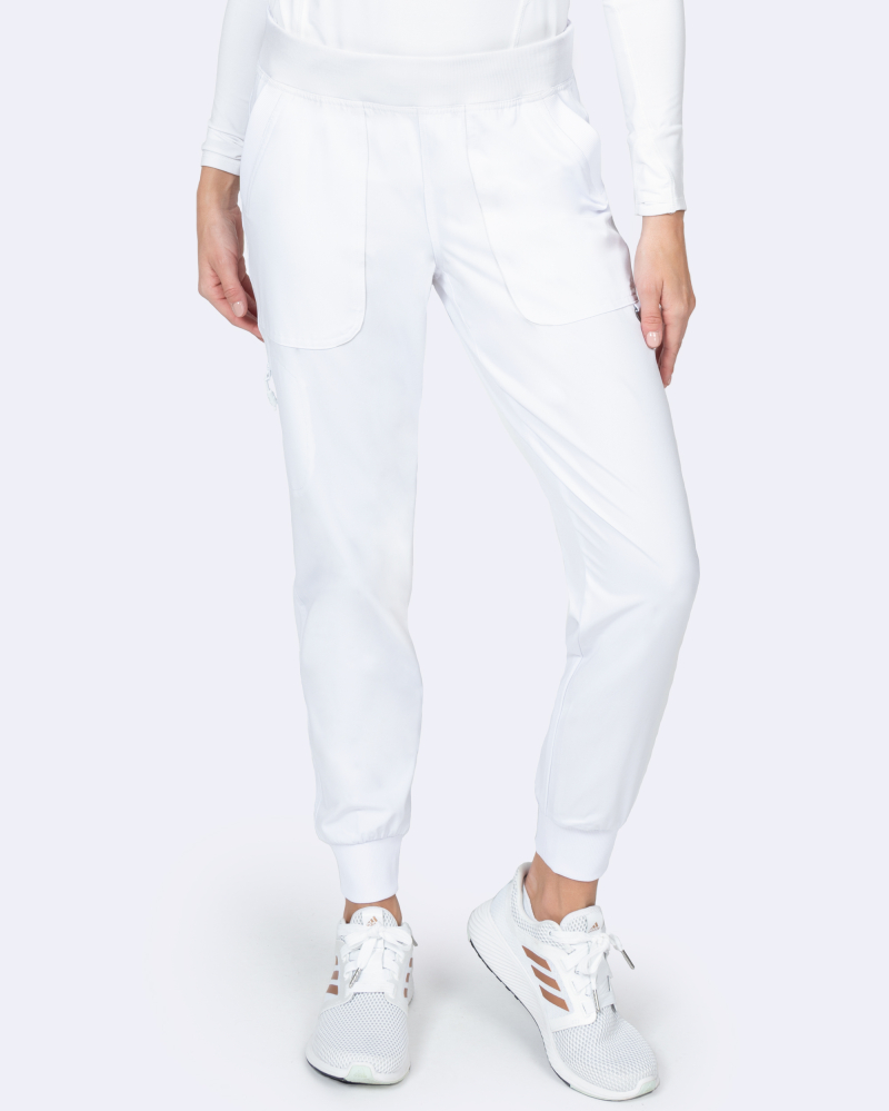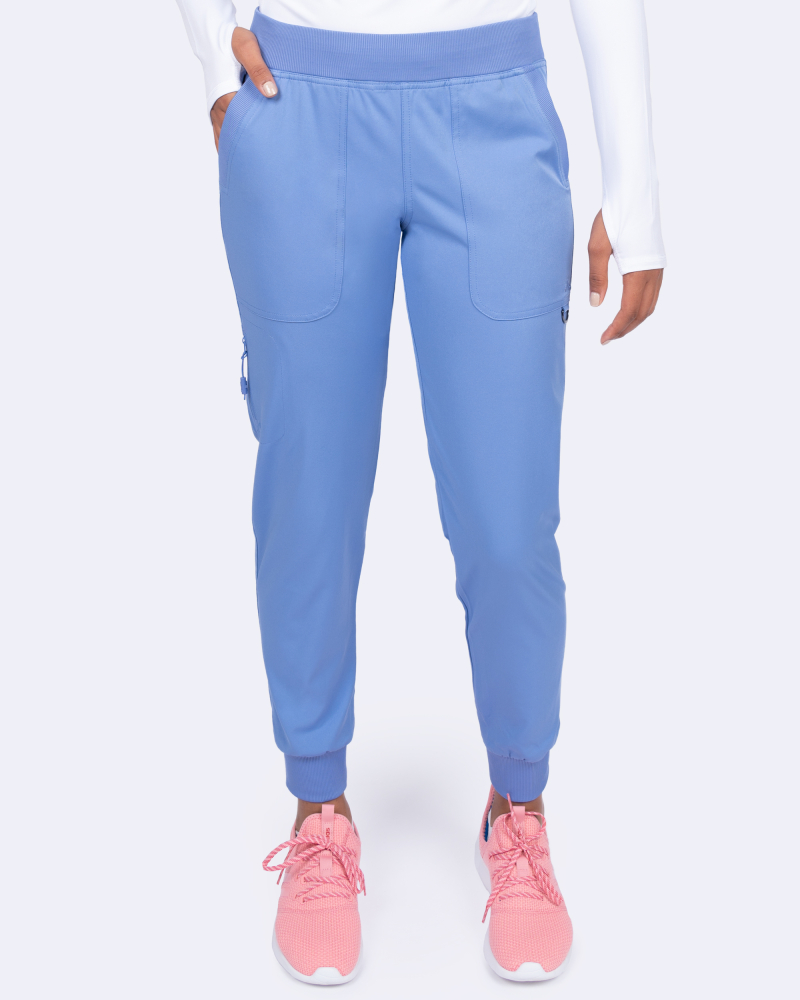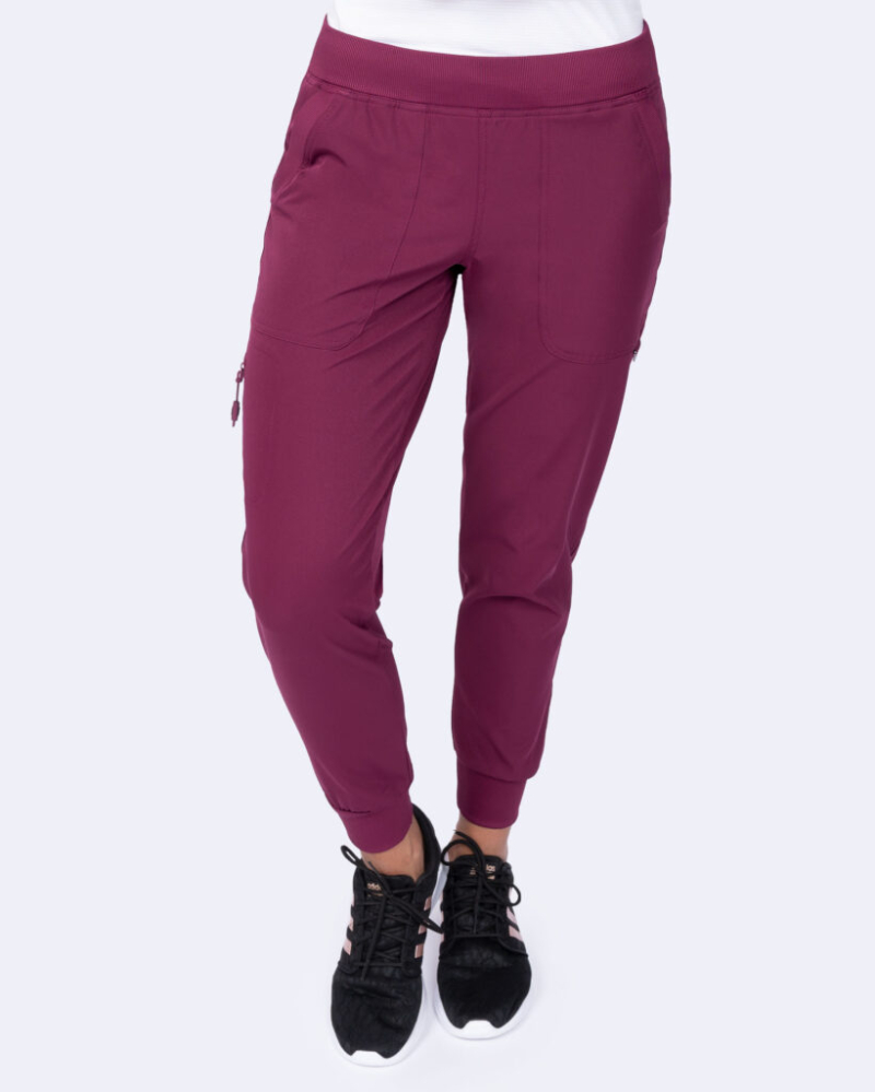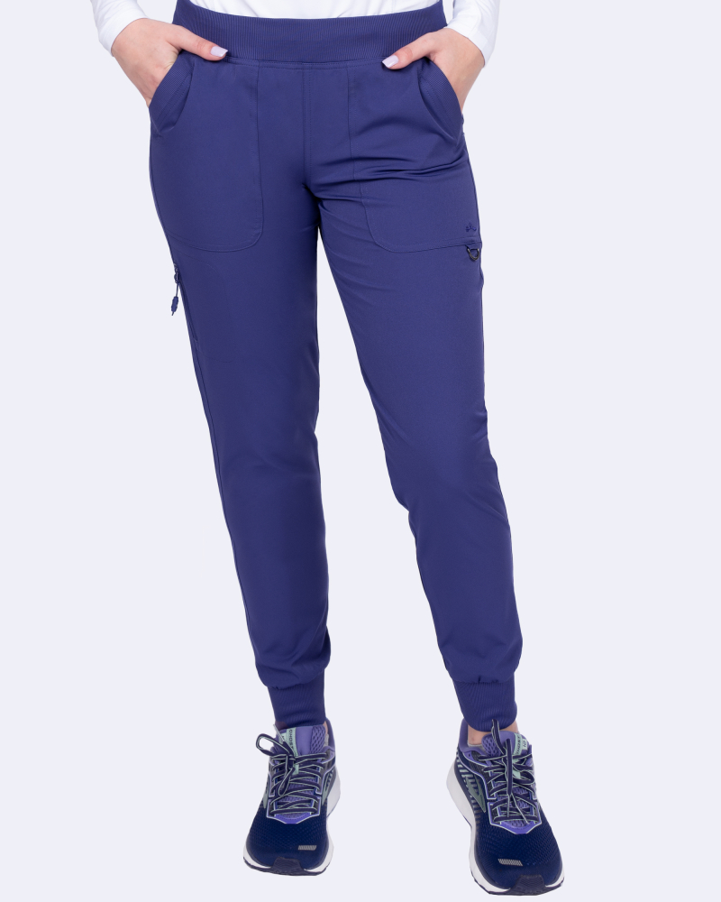Elastic rib knit waistband with internal drawstring Two on-seam front curved patch pockets with rib knit detail at pocket entry Additional front side zipper pocket with removable logo zipper pull Two back curved patch pockets with “Ava Therese” reflective flasher on right pocket Heart arrow logo embroidery on wearer’s left patch pocket Self tab with utility gunmetal d-ring Tapered jogger pant leg with rib knit cuffs