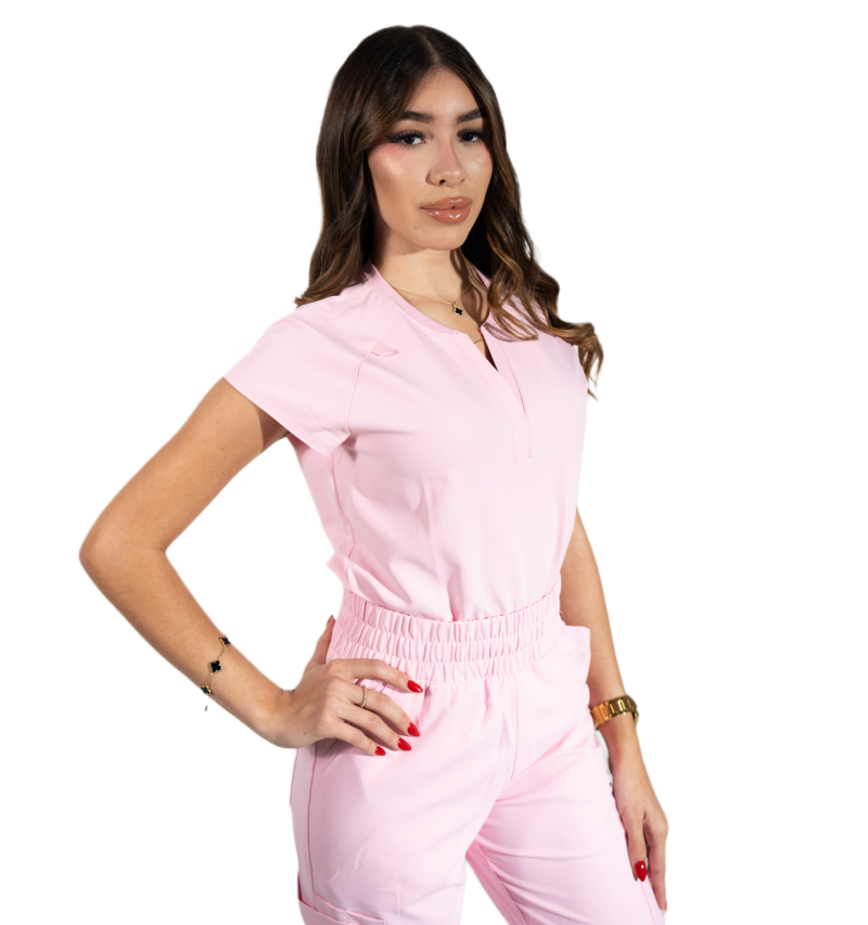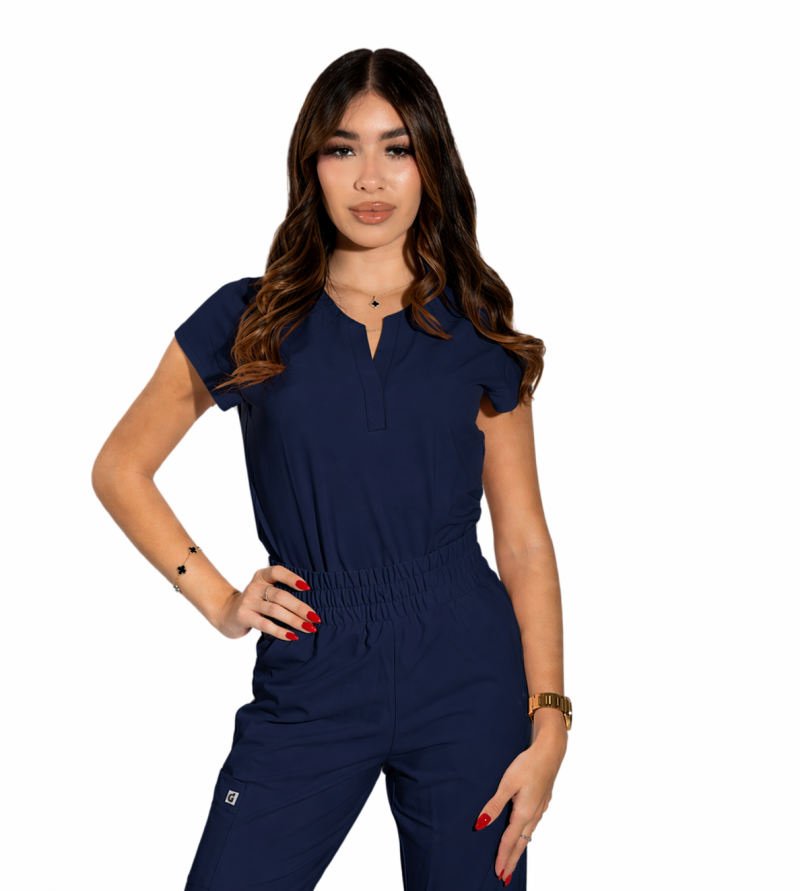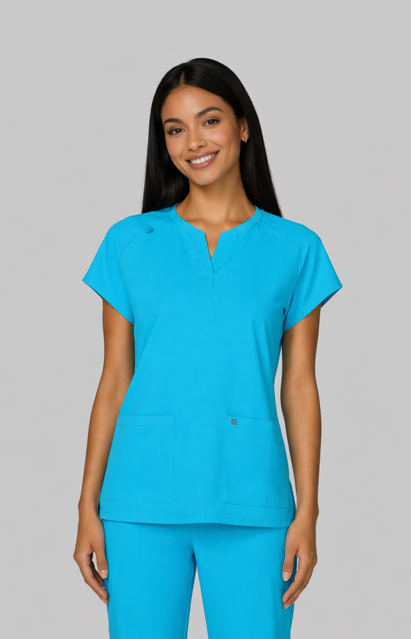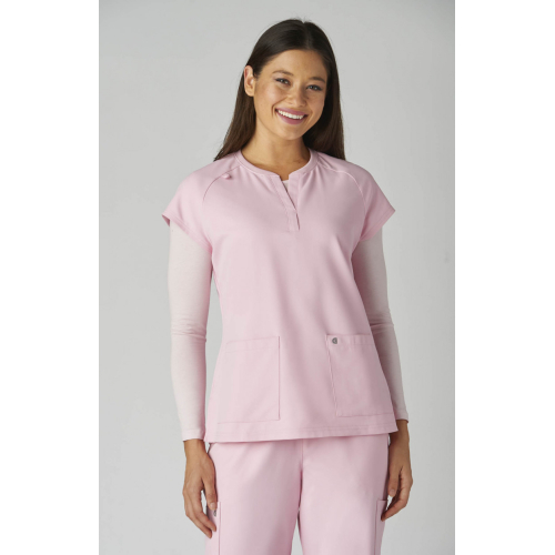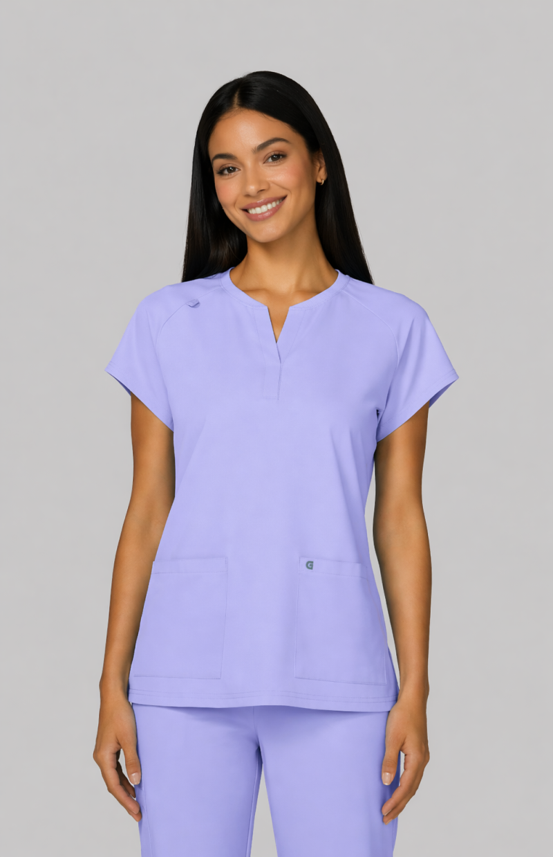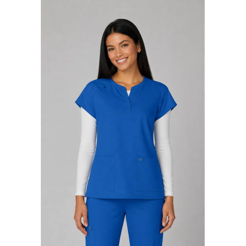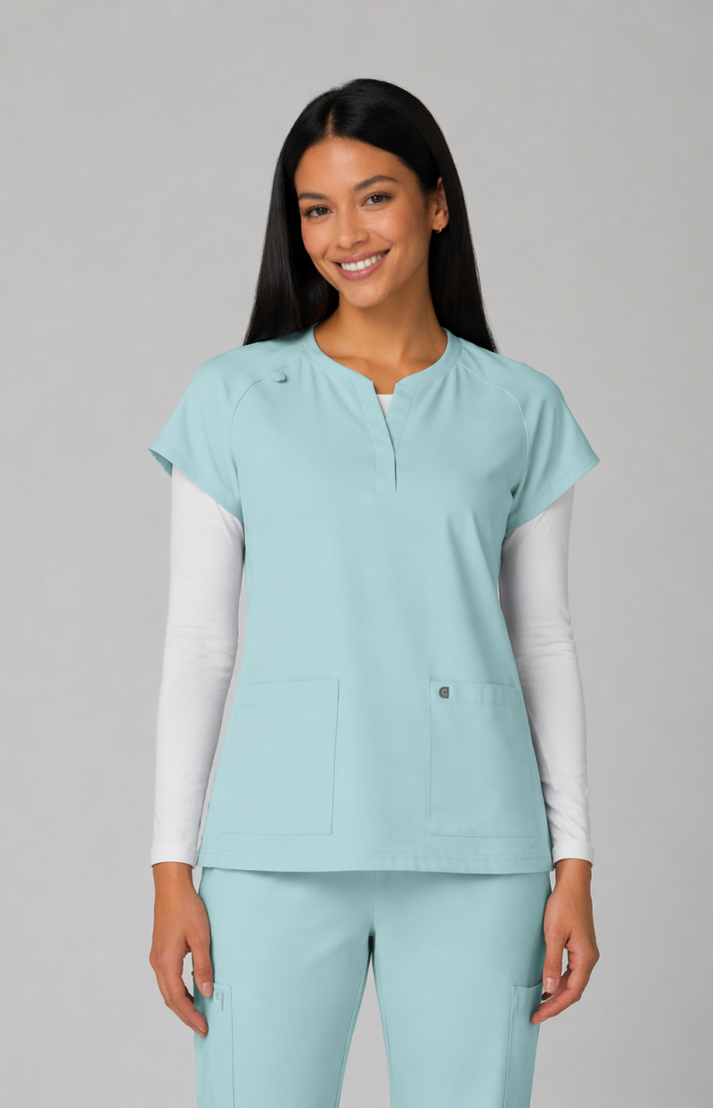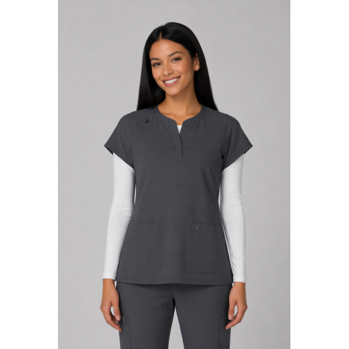 Reese Top– Blusa moderna con cuello en V abierto, mangas raglán para mayor movilidad, dos bolsillos frontales funcionales, 26 pulgadas de largo, tela strech 100% poliéster y diseño comodo con aberturas laterales para facilitar movimiento.